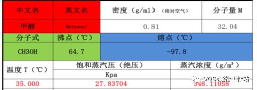 根据安托因方程,核算不同冷凝温度下的甲醇饱和蒸汽浓度,确定冷凝zhongdian温度。