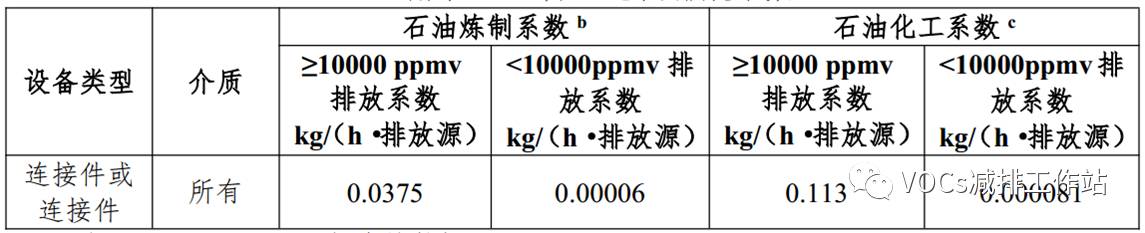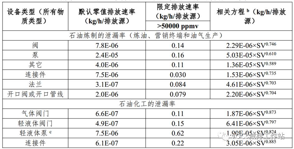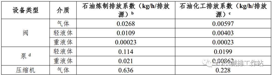 2)平均排放系数法是针对现场不实施任何检测的情况提出的。该法是建立在假设所有设施(根据类型和相态)都在同一泄漏率/量的基础上的,每种组件类型基于历年的平均排放量而核算出的系数,部分系数如下图展示。其核算准确度。这是企业未按照法规实施LDAR体系建立的核算方法,相当于一种惩罚(未做)/鼓励(要去做)的措施。