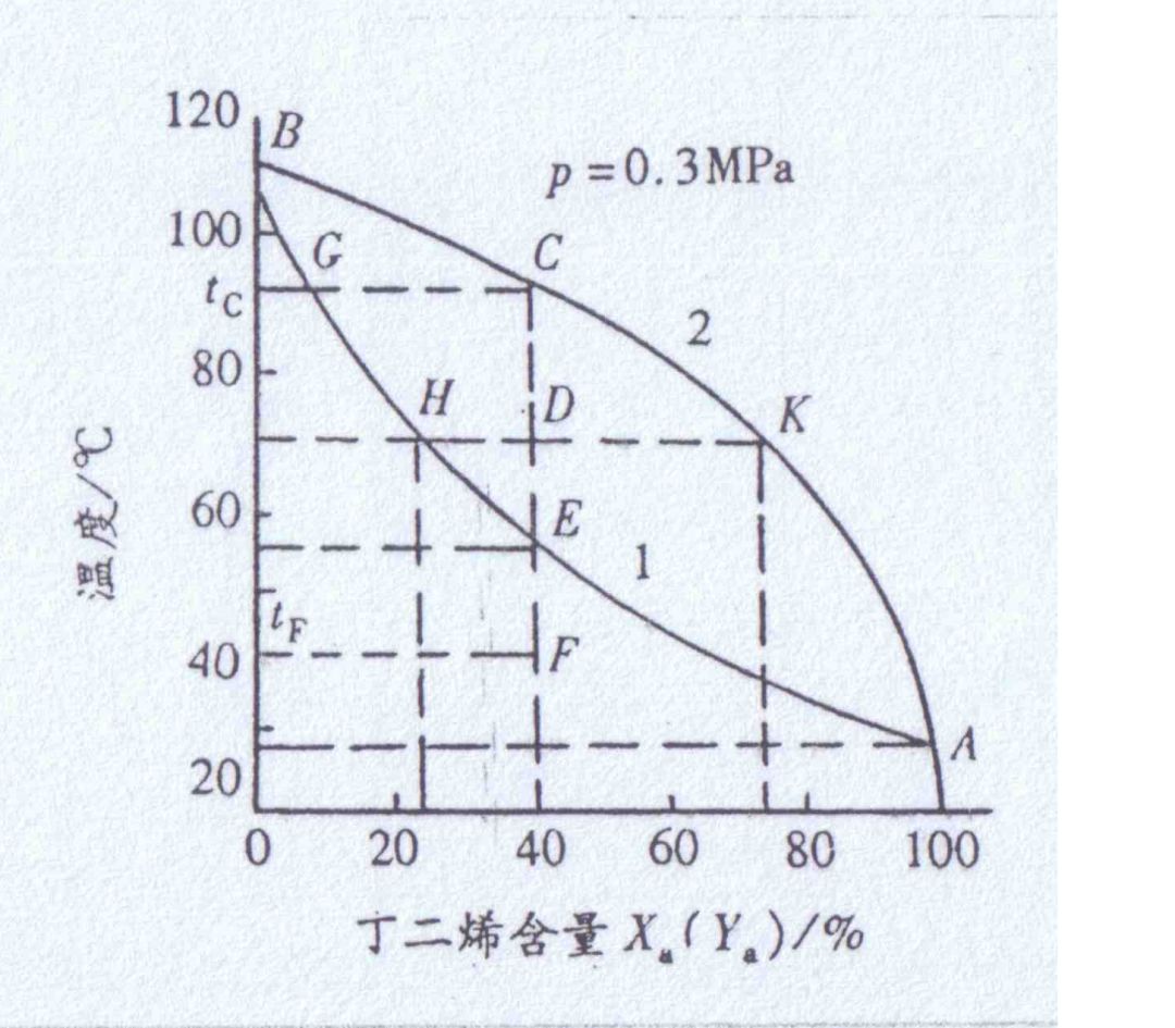 脱水塔中丁二烯和以己烷为主的粗溶剂分离是一个多组分的复杂精馏。工艺设计中,假设塔的进料为由丁二烯(a组分)与己烷(b组分)组成的二元组分理想溶液。设定总压P=0.3Mpa,由丁二烯和己烷的饱和蒸汽压Pa°,Pb° 计算得dao丁二烯-己烷溶液汽液相平衡组成(略),作图得dao丁二烯──己烷的温度组成图 (图3)。