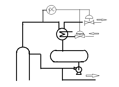 图3-3-212浸没式冷凝器塔压控制方案。热旁通压力控制原理是利用调节主、付管线内通过的气相物料量,通过改变冷凝器内传热面积,使进入冷凝器的饱和蒸汽“”冷凝从而达到压力控制。由于在冷凝器中有不凝气的积聚,它的排出还需要通过排液管形成的液封,释放的阻力,为了降低塔压,不得不打开热旁通阀门,让蒸汽直接排入回流罐,因此热旁通法的放空情况比其他压力控制法 严重。